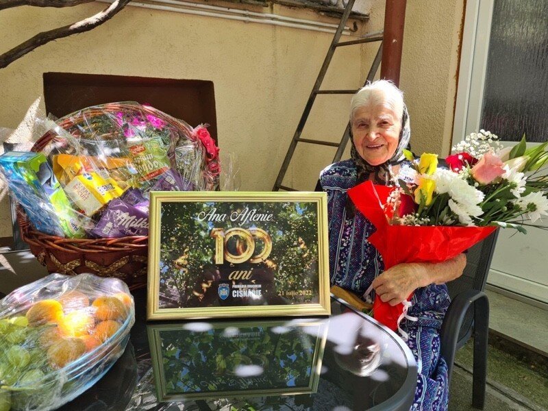 Ana Aftenie a primit ieri, 25 iulie 2022, cadouri și flori din partea reprezentanților Primăriei orașului Cisnădie, cu ocazia aniversării a 100 de ani.