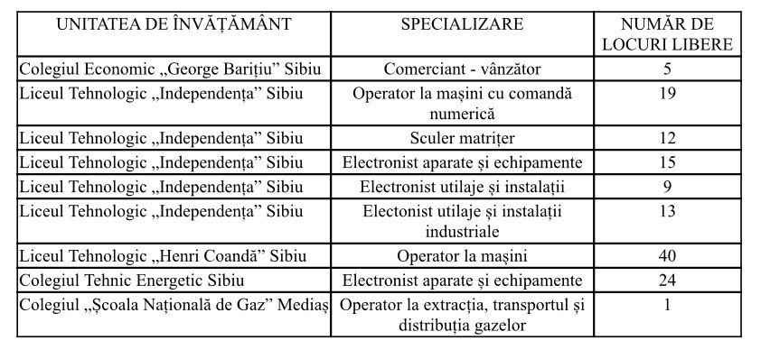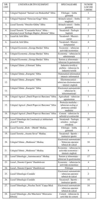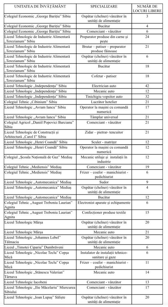 Inspectoratul Școlar Județean Sibiu a publicat luni, 25.07.2022, numărul de locuri libere pentru înscrierea absolvenților clasei a VIII-a nerepartizați sau fără evaluare națională, în etapa a II-a, în învăţământul liceal de stat, învățământul profesional de stat și în învățământul profesional dual.