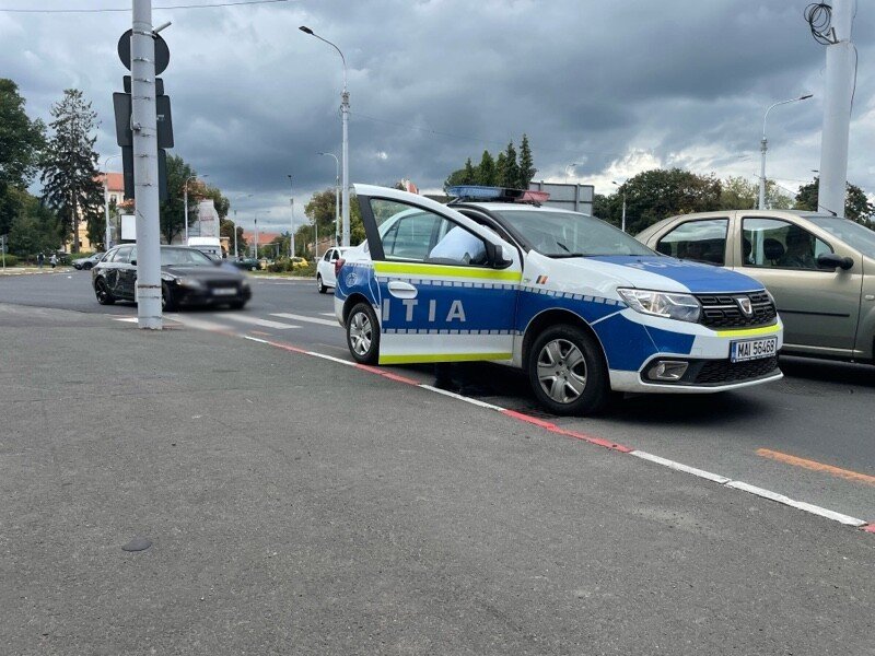 Două mașini au intrat în coliziune, în urmă cu puțin timp, în sensul giratoriu de la intersecția străzilor Corneliu Coposu și Constituției.