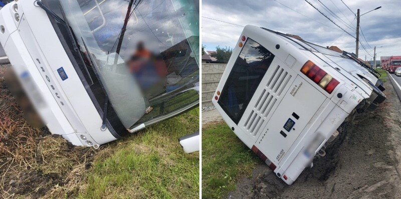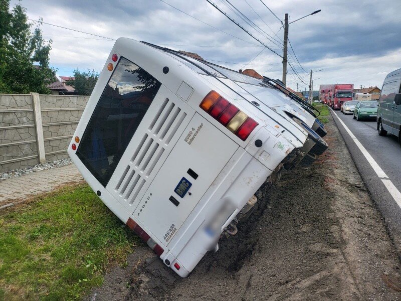 Traficul rutier este îngreunat în localitatea Tălmaciu din județul Sibiu. În cursul zilei de astăzi, șoferul unui autocar a pierdut controlul direcției de deplasare și s-a răsturnat într-un șanț.