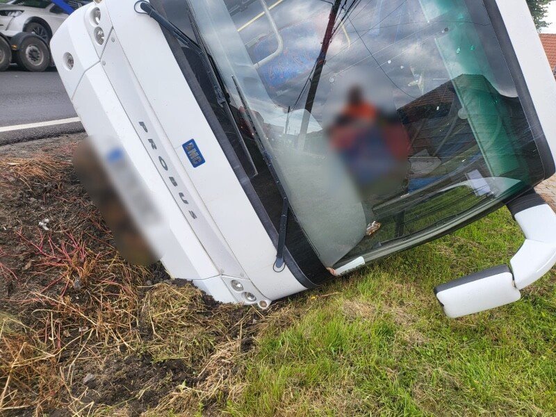 FOTO: Autocar răsturnat într-un șanț din Tălmaciu. Nimeni nu a fost rănit