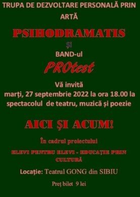 Trupa de dezvoltare personală prin artă „Psihodramatis” și bandul PROtest invită sibienii și nu numai, marți 27 septembrie 2022, de la ora 18:00 la spectacolul de teatru, muzică și poezie intitulat „Aici și acum!”, în cadrul proiectului „Elevi pentru elevi – Educație prin cultură”. Evenimentul se va desfășura la Teatrul „Gong” din Sibiu. Prețul biletului este de 9 lei.