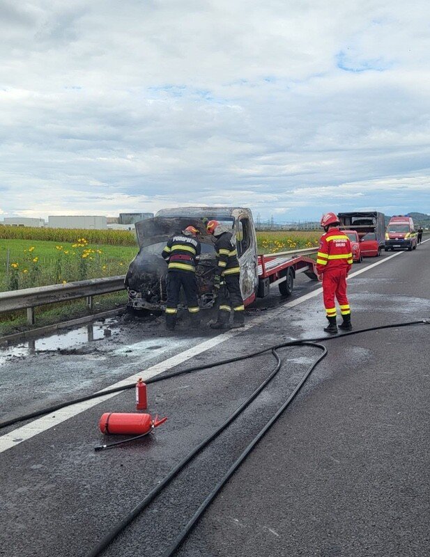 Pompierii militari ai Punctului de Lucru Șelimbăr au intervenit de urgență pe A1 pe sensul de mers spre Veștem, cu o autospecială de stingere și un echipaj SMURD, pentru localizarea și lichidarea unui incendiu.