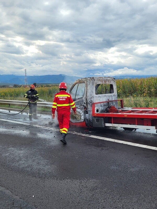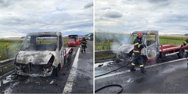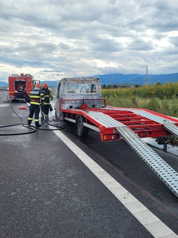 FOTO: Autoplatformă distrusă de foc, pe autostrada A1, lângă Veștem
