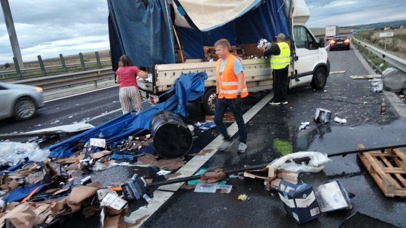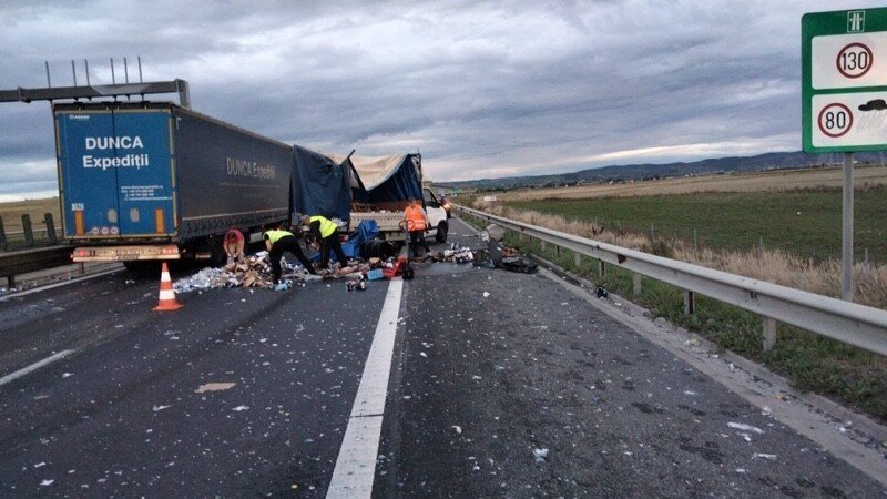 Mai multe lăzi cu whisky și doze Red Bull au ajuns pe carosabilul autostrăzii A1, km. 254, în zona Aeroportului Sibiu, pe sensul Deva – Sibiu. Un microbuz transport persoane și unul de transport marfă au intrat în coliziune.