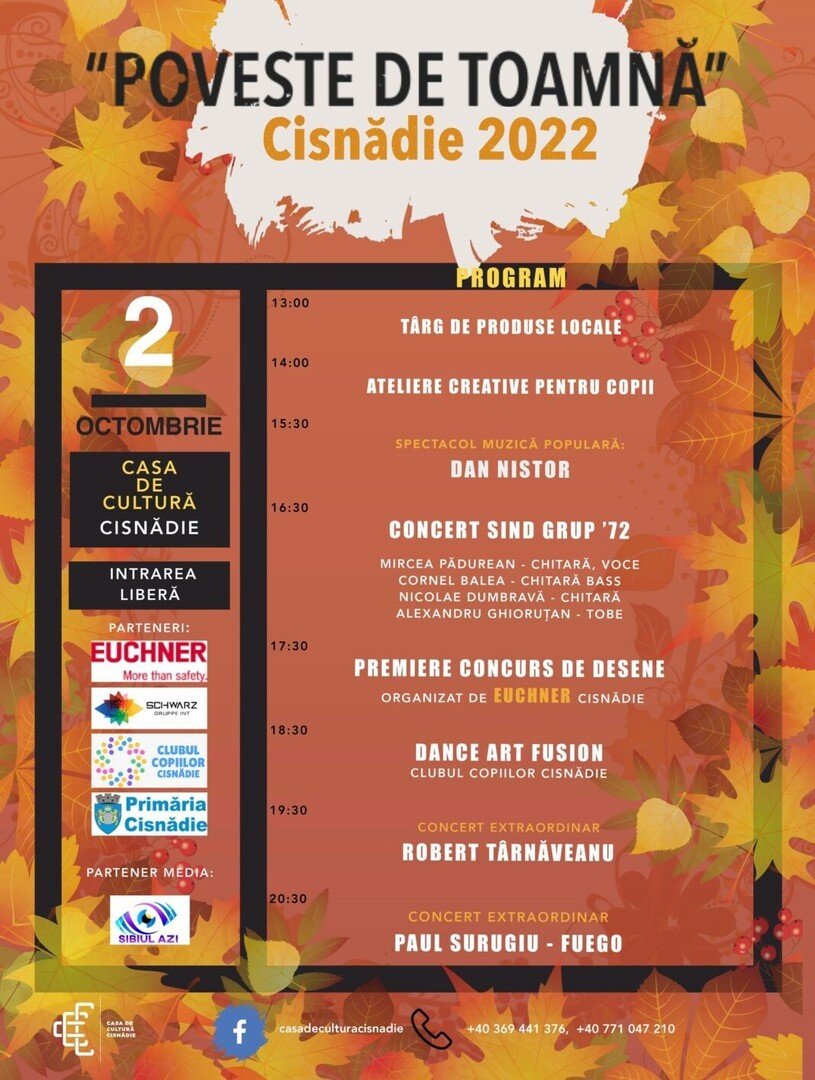 Primăria orașului Cisnădie, prin Casa de Cultură Cisnădie organizează duminică, 2 octombrie 2022 evenimentul „Poveste de Toamnă” – un eveniment la care sunt așteptați participanți de toate vârstele. Organizatorii vor găzdui o expoziție de vânzare de produse tradiționale, ateliere creative pentru copii, spectacol de muzică populară, concerte și multe alte surprize.
