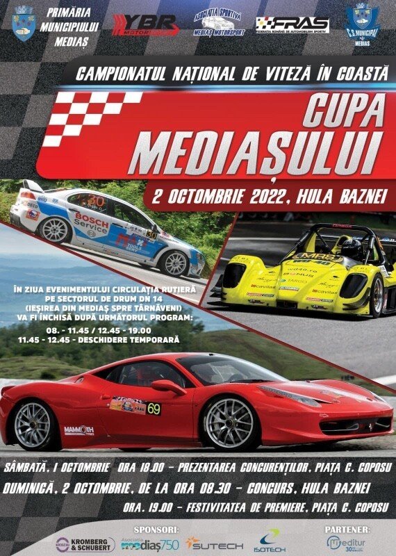 Primăria Municipiului Mediaș, Clubul Sportiv Municipal Mediaș alături de Federația Română de Automobilism Sportiv vor organiza la Mediaș, în zilele de sâmbătă și duminică, 1 respectiv 2 octombrie 2022, etapa cu numărul 7 din cadrul Campionatului Național de Viteză în Coastă, potrivit mirceahodarnau.ro.