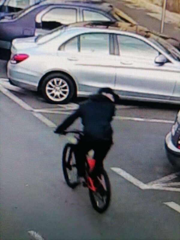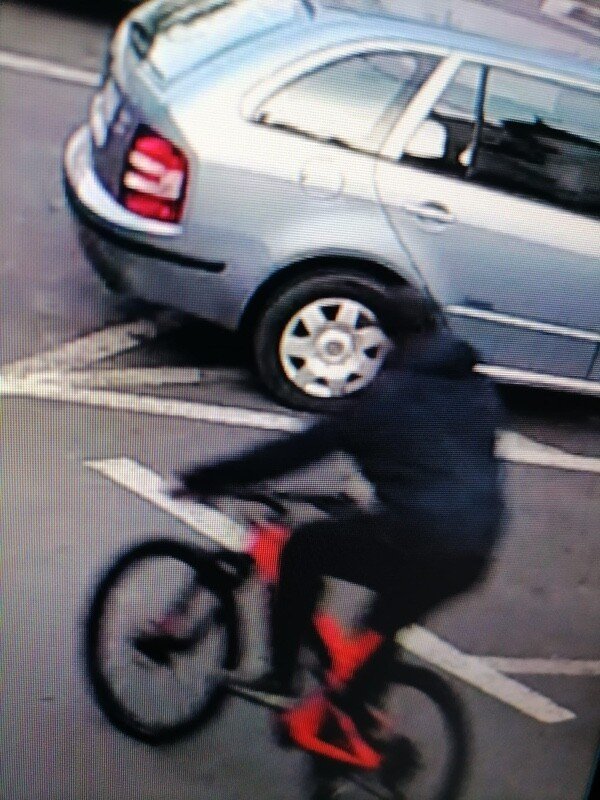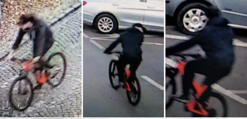 Polițiștii sibieni caută un tânăr în jur de 30 de ani, îmbrăcat în pantaloni sport și geacă de culoare închisă. Pe cap purta o șapcă de culoare negru. Bicicleta este una de teren, roșie cu furcă neagră.