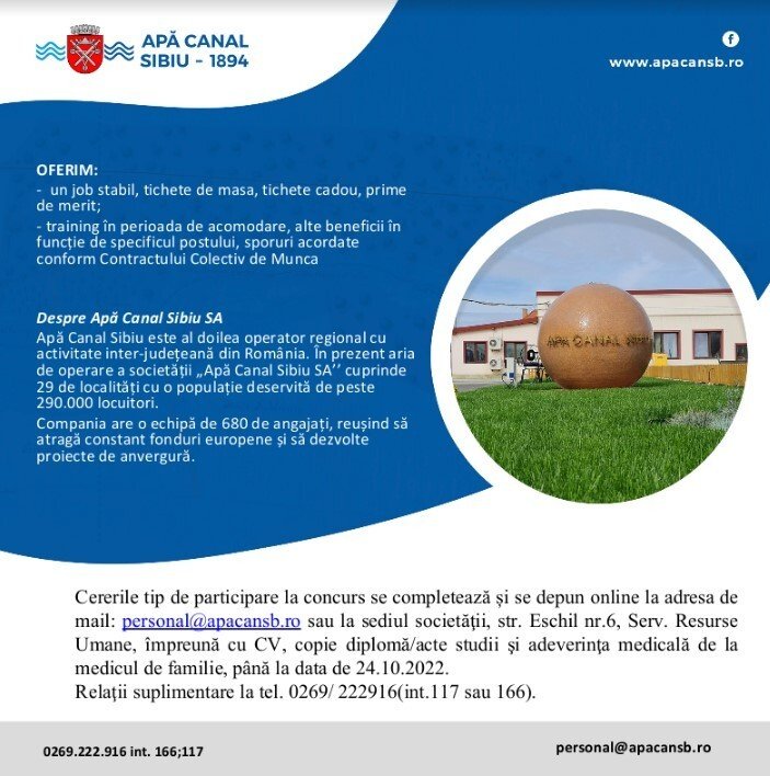 Cererile tip de participare la concurs se completează și se depun online la adresa de mail personal@apacansb.ro sau la sediul societăţii, str. Eschil nr.6, Serv.Resurse Umane, împreună cu CV, copie diplomă studii şi adeverinţa medicală de la medicul de familie, până la data de 24.10.2022. Relaţii suplimentare la tel. 0269/ 222916(int.117 sau 166).