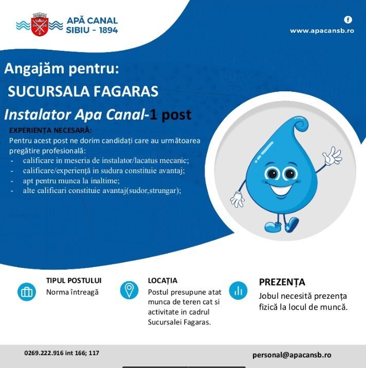 APĂ CANAL SIBIU S.A. angajează pentru SUCURSALA EXPLOATARE FAGARAȘ