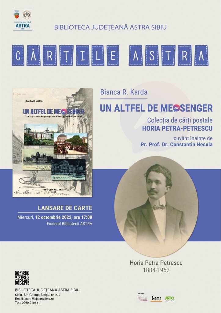 Biblioteca Județeană ASTRA Sibiu, instituție ale cărei acțiuni sunt posibile cu finanțare din partea Consiliului Județean Sibiu, invită publicul larg la evenimentul de lansare a volumului „Un altfel de messenger. Colecția de cărți poștale Horia Petra-Petrescu” de Bianca R. Karda. Prefațată de Pr. Prof. Dr. Constantin Necula, publicația reprezintă încununarea unui amplu demers de cercetare dedicat personalității lui Horia Petra-Petrescu, realizat de bibliotecara astristă Bianca R. Karda.