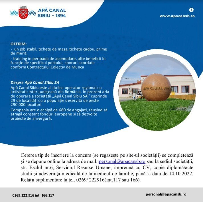 Cererile tip de participare la concurs se completează și se depun online la adresa de mail personal@apacansb.ro sau la sediul societăţii, str. Eschil nr.6, Serv.Resurse Umane, împreună cu CV, copie diplomă studii şi adeverinţa medicală de la medicul de familie, până la data de 14.10.2022. Relaţii suplimentare la tel. 0269/ 222916(int.117 sau 166).