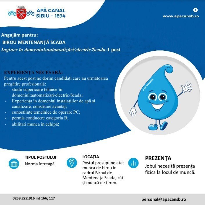 APĂ CANAL SIBIU S.A. angajează pentru :