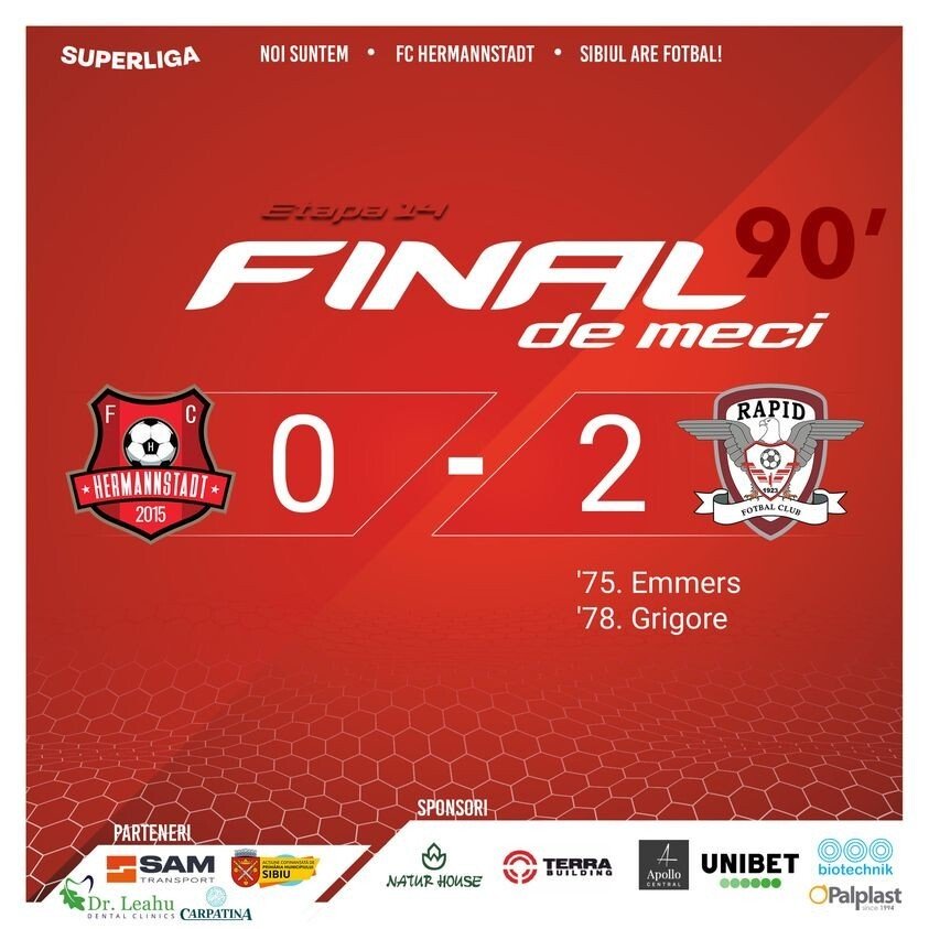 Hermannstadt rămâne pe locul 4 în clasament având și un meci în minus, restanța cu CFR Cluj.