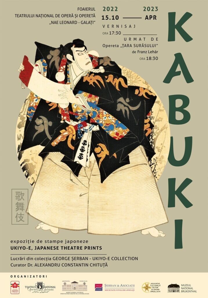 Expoziţia de stampe japoneze cu tema teatrul Kabuki va putea fi văzută în perioada 15 octombrie 2022 – 15 aprilie 2023, în foaierul teatrului gălățean. ,,Această expoziţie s-a născut din dorinţa de a explora şi a prezenta iubitorilor de artă un episod fascinant al culturii japoneze: arta ukiyo-e. În cadrul expoziţieivor fi expuse peste 100 de stampe japoneze realizate în perioada secolelor 17 -19, (perioada Edo și perioada Meiji), conţinând imagini ale actorilor şi scene de teatru kabuki. Invităm toţi vizitatorii la o incursiune în lumea fascinantă a gravurii, la o călătorie imaginară în Țara Soarelui răsare, familiarizându-se cu un univers artistic de mare originalitate”, a declarat curatorul expoziţiei, Alexandru Constantin Chituţă.