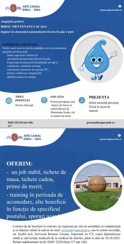 APĂ CANAL SIBIU S.A. angajează pentru BIROU MENTENANȚĂ SCADA, INGINER în domeniul automatizari /electric/Scada – 1 post