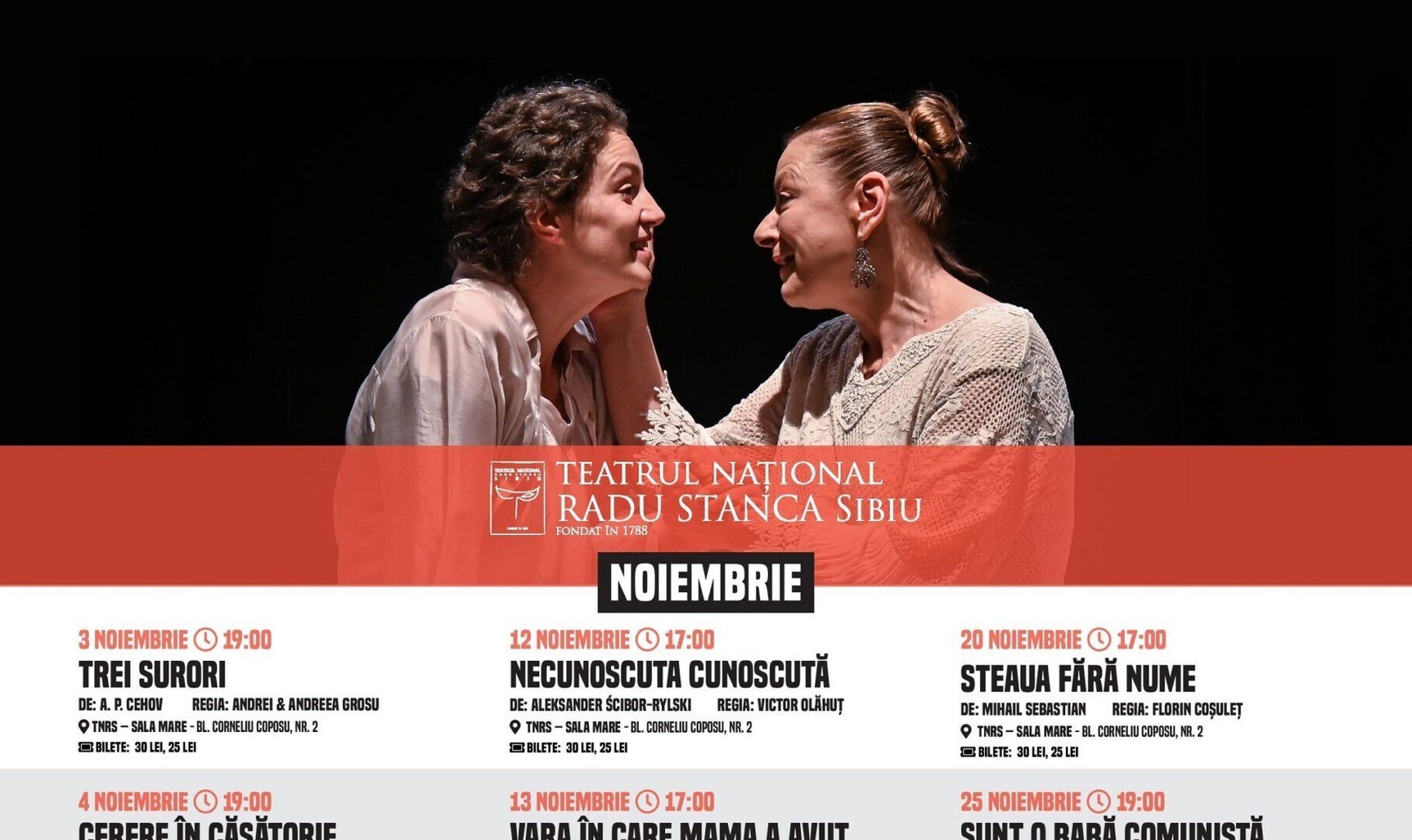 Teatrul Național „Radu Stanca” Sibiu (TNRS) oferă publicului, în luna noiembrie, un program bogat, care cuprinde 19 reprezentații, dar și variat, astfel încât iubitorii de teatru să se poată bucura de spectacole pe gustul lor.