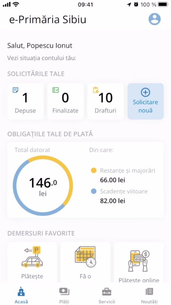 - Aceasta este în primul rând un instrument de plată. Toate cele peste 100 de tipuri de plăți pe care le puteți efectua pe platforma de e-administrație și la ghișeul digital, le puteți realiza și în aplicație. Condiția este să aveți un cont validat cu aplicația certMe, o măsură pentru siguranța datelor dumneavoastră.