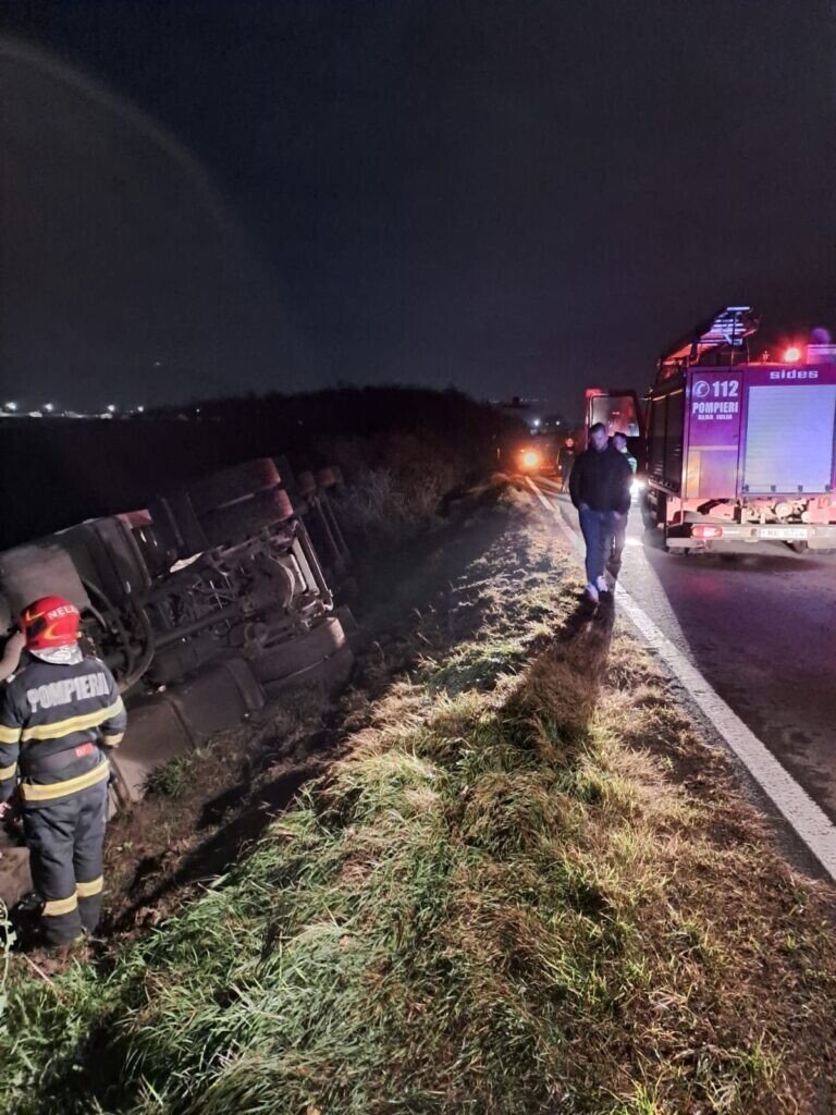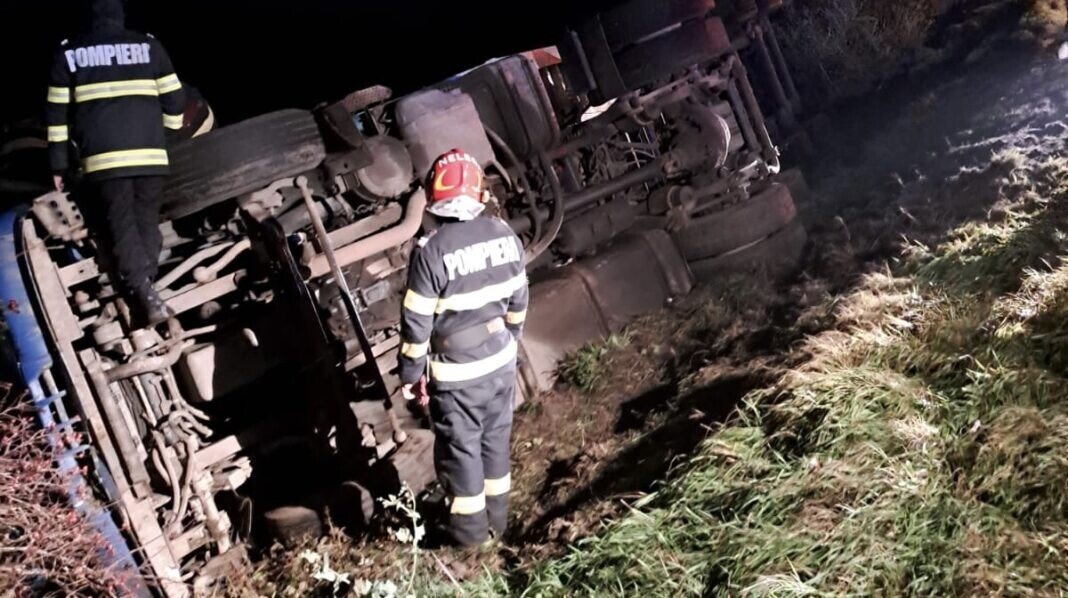 FOTO: Autocamion înmatriculat în județul Sibiu, răsturnat la Cunța