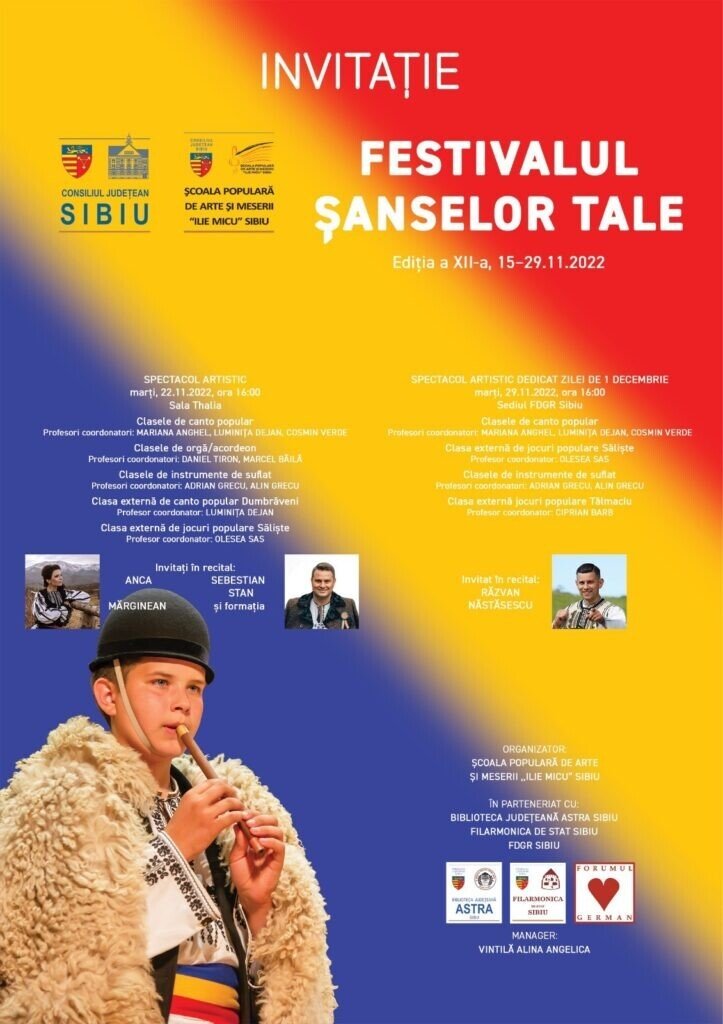 Consiliul Județean Sibiu, prin Școala Populară de Arte și Meserii „Ilie Micu” Sibiu, în parteneriat cu FDGR, organizează marți 29 noiembrie 2022, începând cu ora 16:00, la sediul FDGR, în sala oglinzilor, un spectacol artistic dedicat Zilei Naționale, în cadrul Festivalului Șanselor Tale Ediția a XII-a.