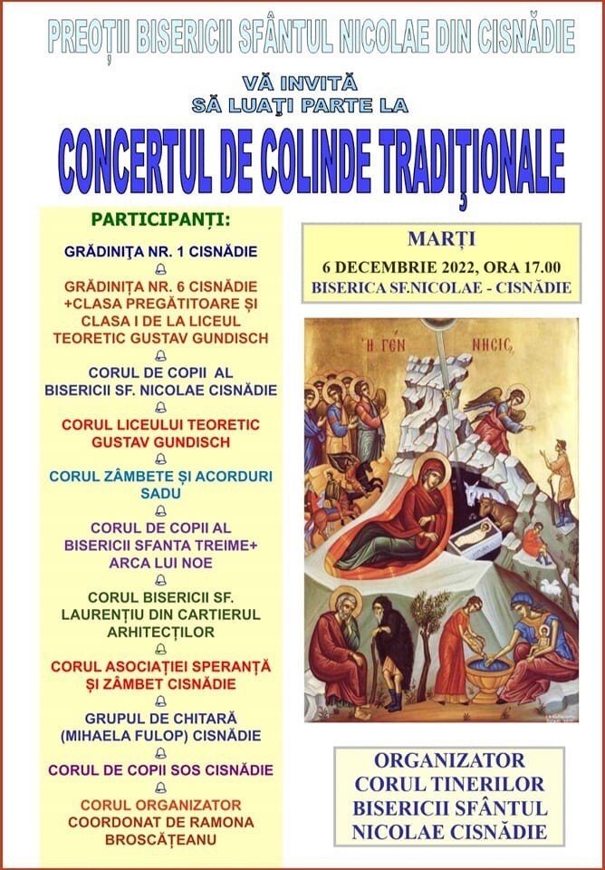 Concertul de Colinde Tradiționale, organizat de Corul Tinerilor Bisericii „Sfântul Nicolae” va avea loc marți, 6 decembrie 2022, începând de la ora 17:00 la Biserica „Sfântul Nicolae” din Cisnădie.