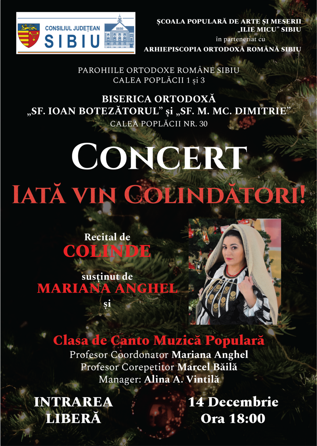 Consiliul Județean Sibiu, prin Școala Populară de Arte și Meserii „Ilie Micu” Sibiu, în parteneriat cu Biserica Ortodoxă Sf. Ioan Botezătorul și Sf. M. Mc. Dimitrie, organizează miercuri, 14 decembrie 2022, începând cu ora 18:00, concertul: „Iată, Vin Colindători!”
