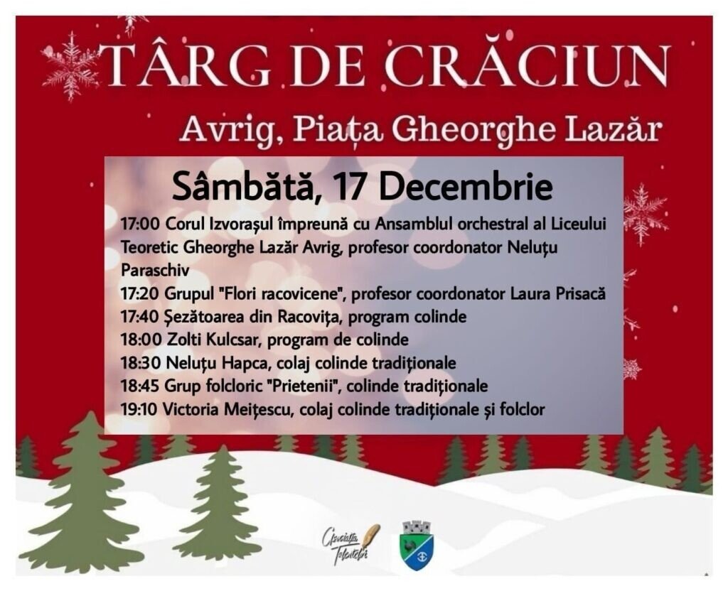 Organizatorii au pregătit un program special de colinde și cântece de iarnă, Corul „Izvorașul” , împreună cu Ansamblul orchestral al Liceului Teoretic „Ghe. Lazăr” Avrig, Zolti Kulcsar, Neluțu Hapca, Victoria Meițescu dar și invitați speciali de la Racovița.