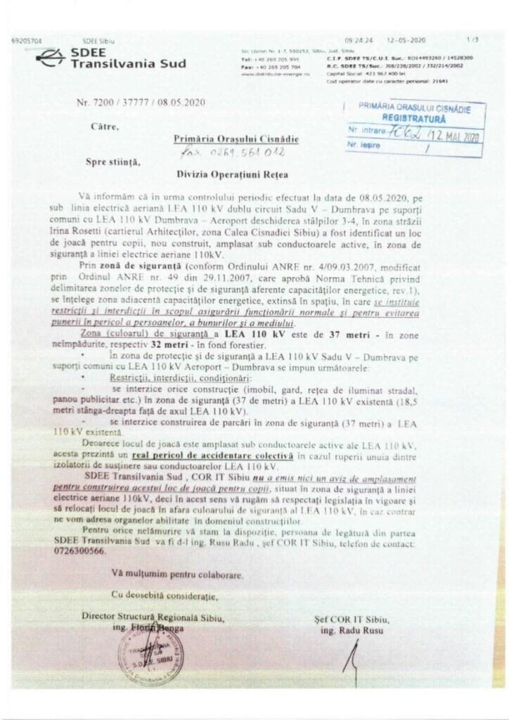 Și tot SDEE cere “vă rugăm să respectați legislația în vigoare și să relocați locul de joacă în afara culoarului de siguranță LEA 110 kV, în caz contrar ne vom adresa organelor abilitate în domeniul construcțiilor”.