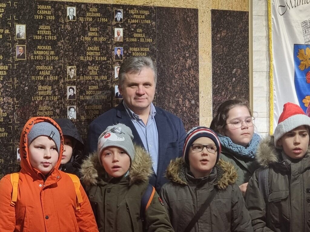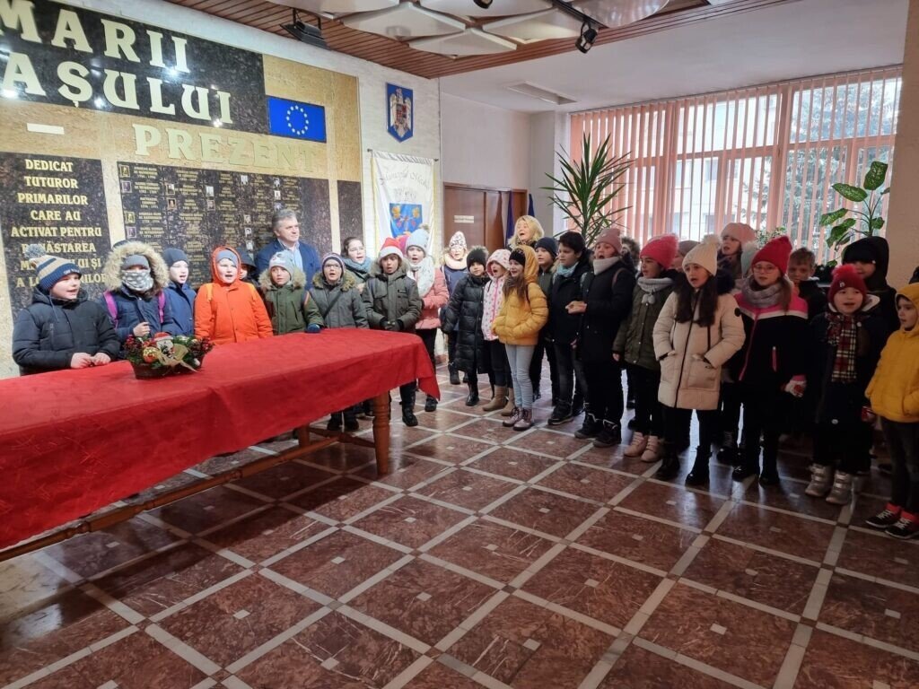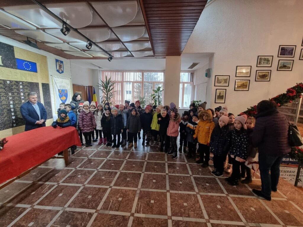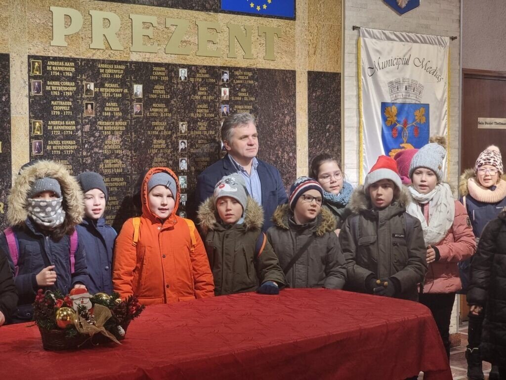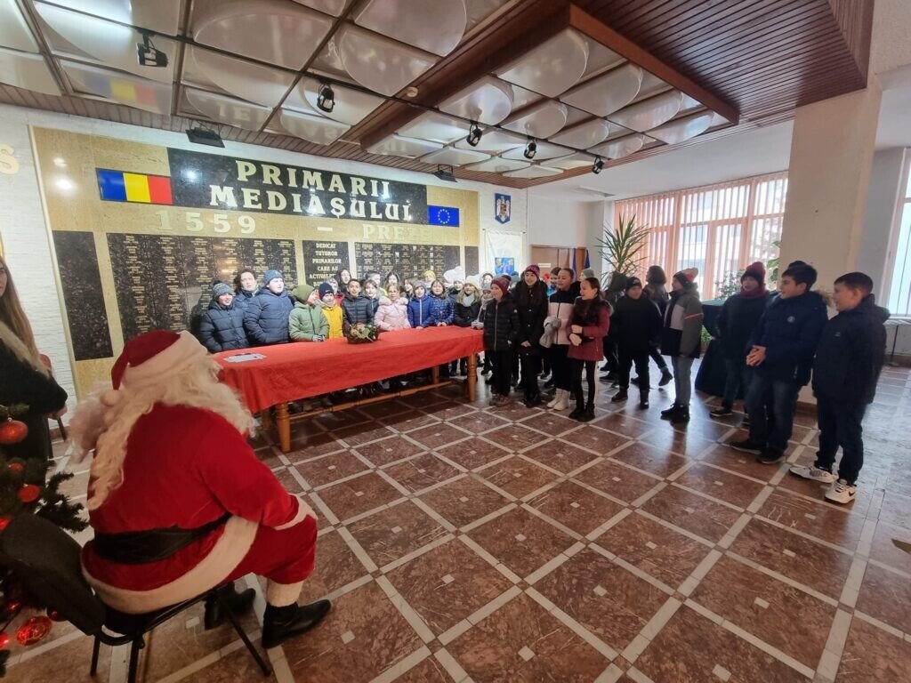 În urma programării stabilite cu unitățile de învățământ, copiii din grădinițele și școlile gimnaziale medieșene, alături de cadrele didactice, au trecut pragul municipalității, fiind întâmpinați de edilii medieșeni, dar și de însuși Moș Crăciun.
