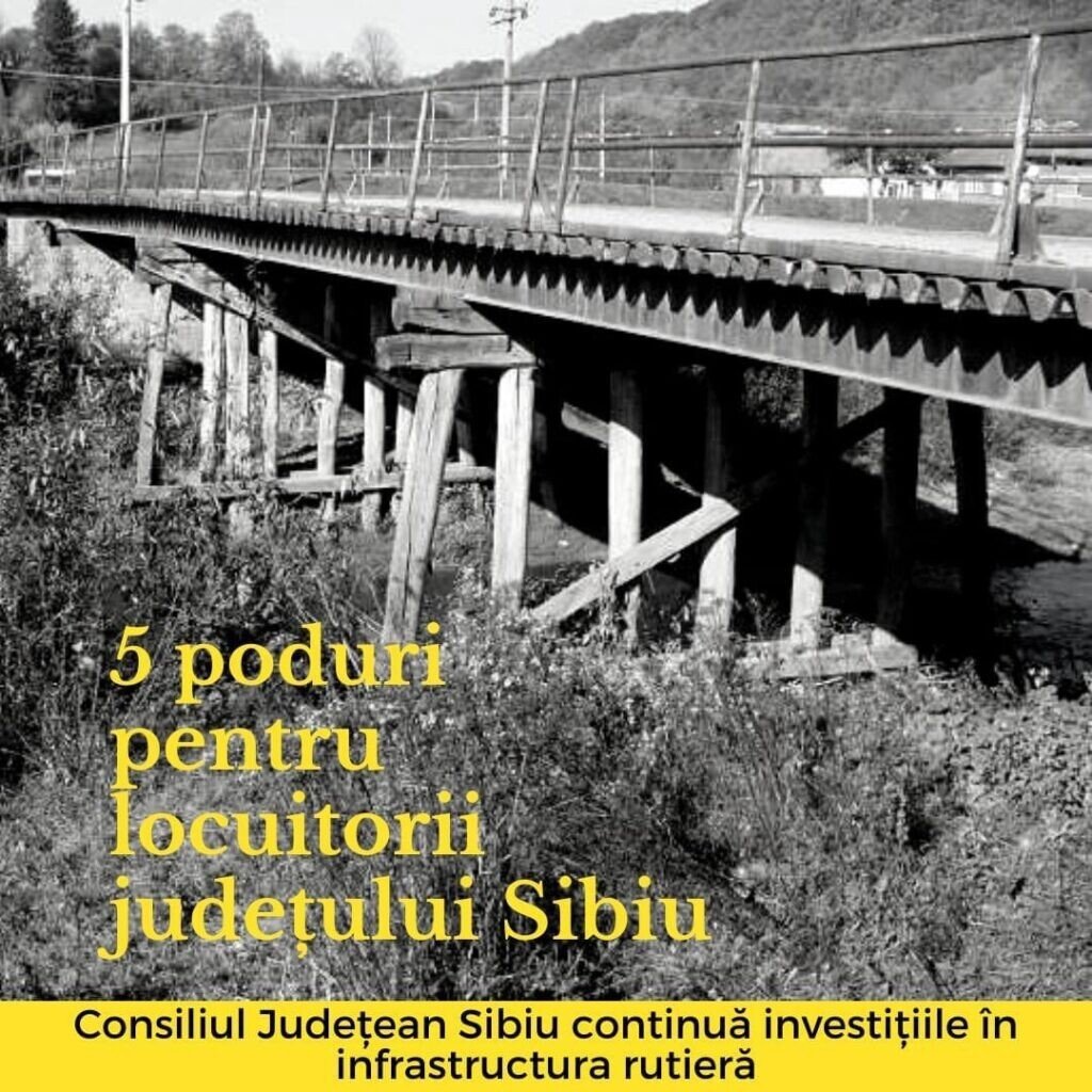 Investițiile Consiliului Județean Sibiu vor crește siguranța participanților la trafic prin construirea a 4 poduri noi și reabilitarea unuia, mulțumită unor lucrări ce însumează aproape 33 de milioane lei;