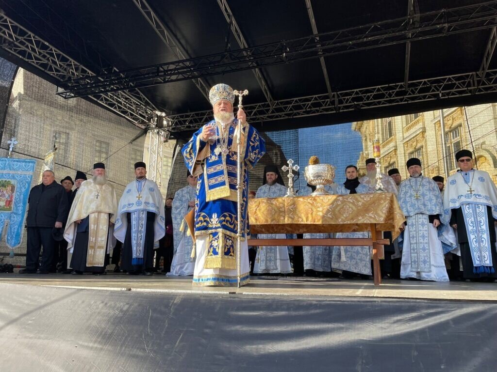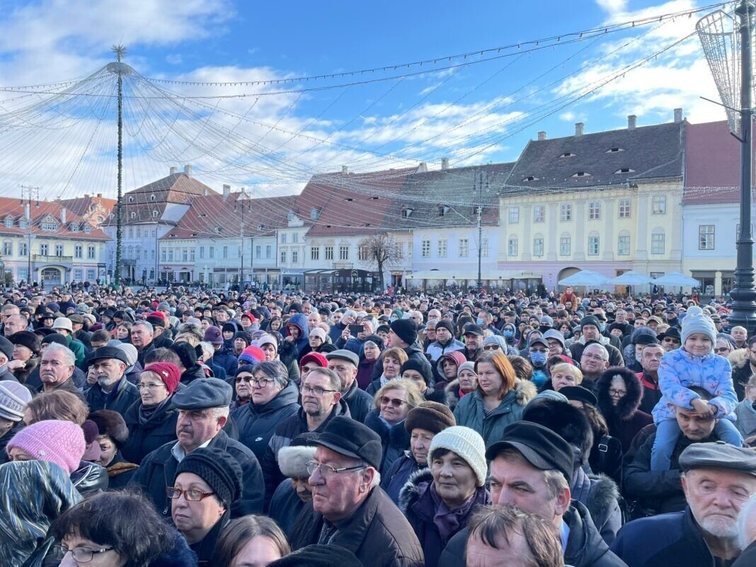 La slujba de Bobotează oficiată de un sobor de preoţi în frunte cu ÎPS Laurenţiu Streza au participat peste 10.000 de credincioşi în centrul municipiului Sibiu, unde ierarhii au oferit peste 10.000 de litri de apă sfinţită la final.