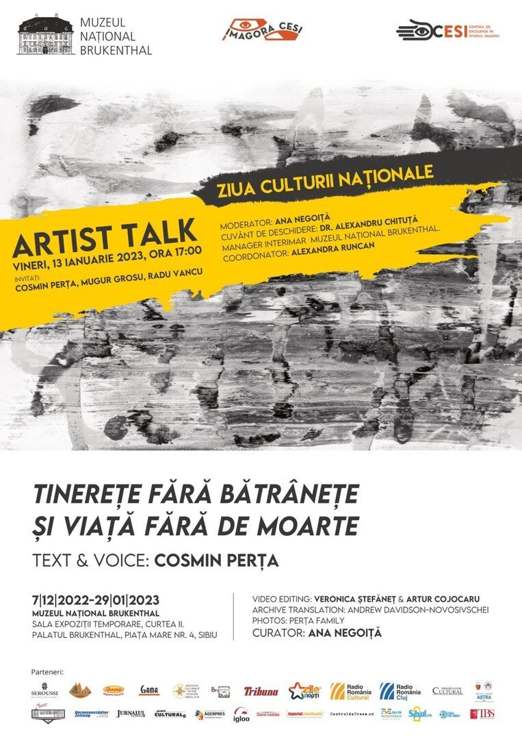Muzeul Național Brukenthal vă invită vineri, 13 ianuarie 2023, începând cu ora 17:00 la un artist talk cu Cosmin Perța dedicat proiectului “Tinerețe fără bătrânețe și viață fără de moarte.” Cosmin Perța – eseist, poet și prozator român – va fi prezent alături de invitații săi Mugur Grosu și Radu Vancu.