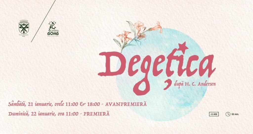 Teatrul pentru Copii și Tineret „Gong” Sibiu prezintă duminică, 22 ianuarie, de la ora 11:00, premiera comercială a spectacolului „Degețica” după H. C. Andersen, în regia Oanei Leahu. Cea mai nouă producție e teatrului sibian va putea fi urmărită, de asemenea, în avanpremieră, sâmbăta aceasta de la orele 11:00 și 18:00.