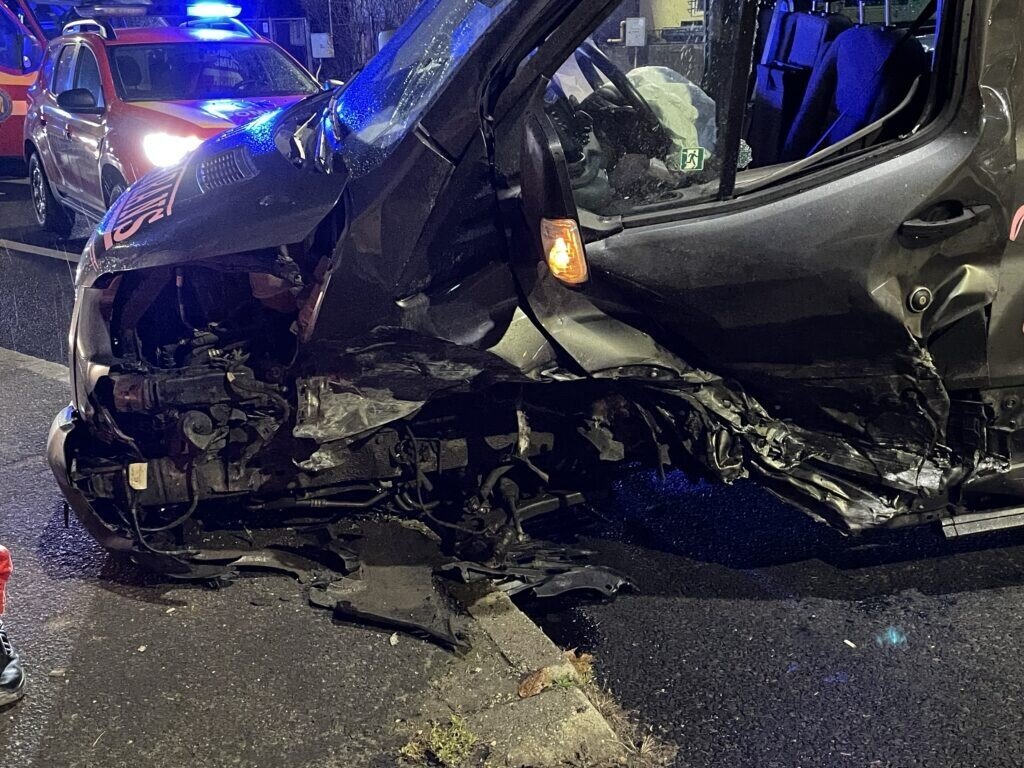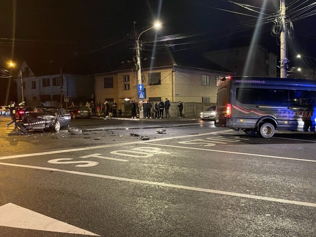 O mașină și un microbuz de transport persoane au intrat într-o coliziune violentă. În urma impactului, microbuzul a ajuns pe trotuar. Acesta transporta angajații unei fabrici din Sibiu. Conform ISU SIBIU, în evenimentul rutier sunt implicate 5 persoane, fiind conștiente.