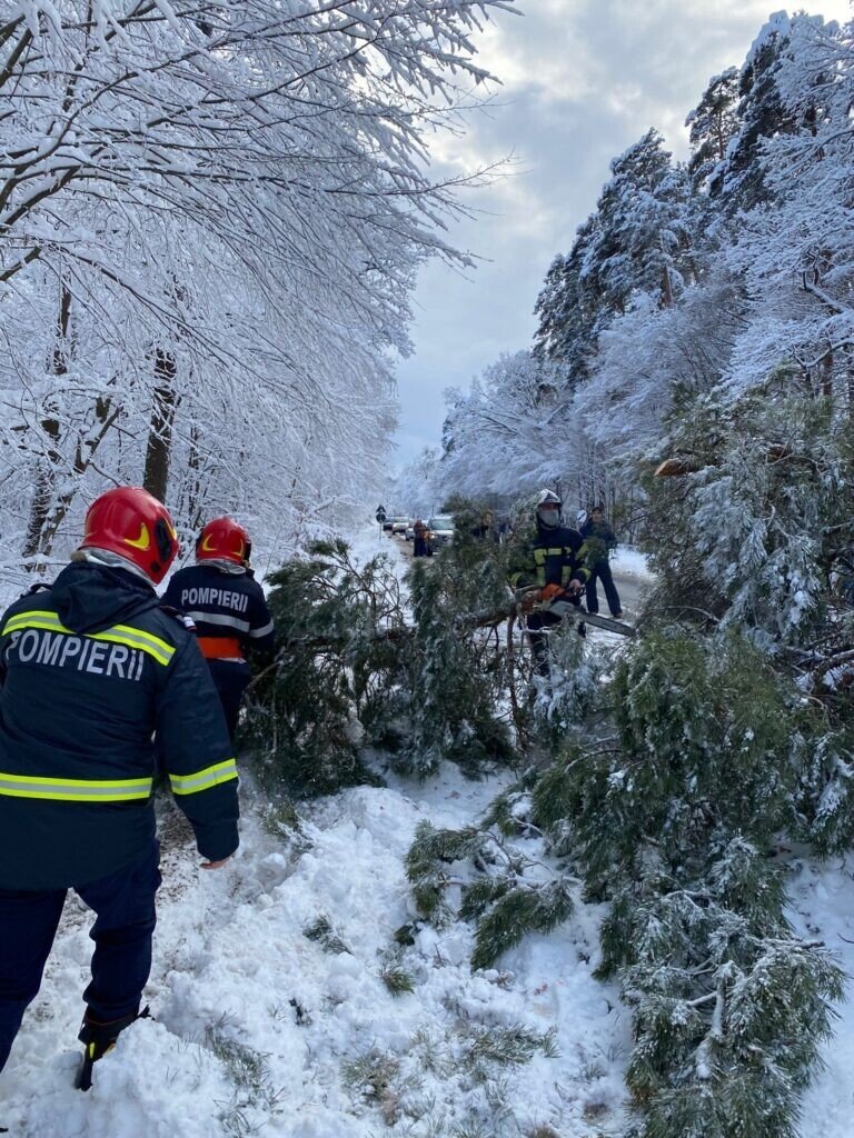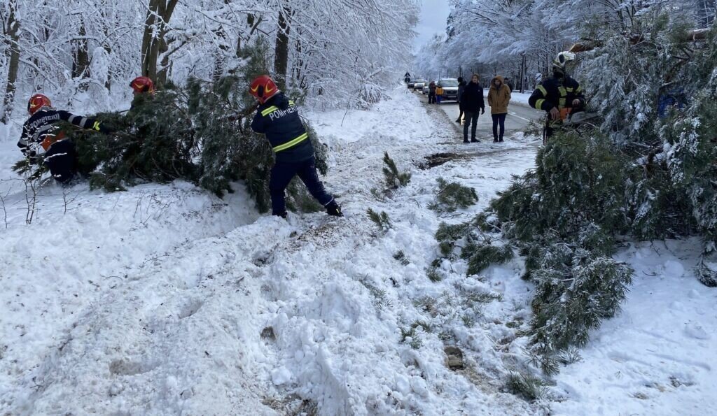 Pompierii militari sibieni intervin în aceste momente pentru îndepărtarea de pe carosabil a unui copac căzut pe DJ 106 – drumul spre Rășinari, în zona Muzeului Astra.