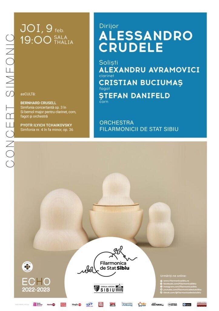 Joi, 9 februarie 2023, ora 19.00, la Sala Thalia, orchestra Filarmonicii de Stat Sibiu va susține un nou concert simfonic în cadrul stagiunii 2022/2023 „EChO”, sub bagheta maestrului Alessandro Crudele.