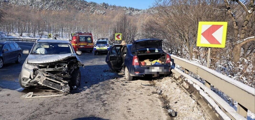 Două mașini au intrat într-o coliziune frontală violentă pe DN 14, la ieșirea din Slimnic spre municipiul Mediaș.