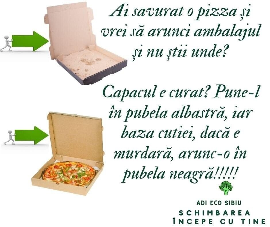 NU pune baza murdară a cutiei de pizza în pubela albastră, pentru că astfel vei contamina toată cantitatea de hârtie și carton colectată corect!
