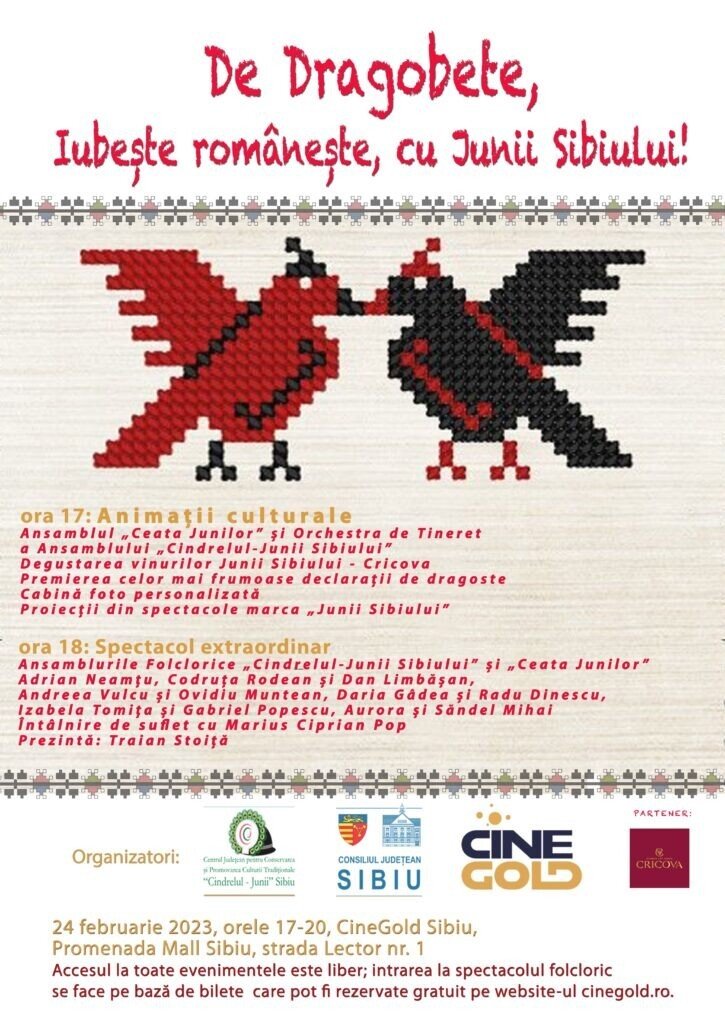 Provocăm tinerii îndrăgostiţi şi îndrăgostiţii cu suflete tinere să celebreze iubirea, în mod tradițional, dar cu multe surprize, alături de Junii Sibiului. Astfel, vineri 24 februarie 2023, orele 17-20, vom spune împreună: „De Dragobete, Iubește Românește, cu Junii Sibiului!”, în cadrul unui eveniment complex care va fi găzduit de un spațiu inedit – CineGold din incinta Promenada Mall Sibiu (str. Lector nr. 1-3). Manifestarea este organizată de CJCPCT „Cindrelul-Junii” Sibiu, din subordinea Consiliului Județean Sibiu, și CineGold Sibiu; partener: Cricova.