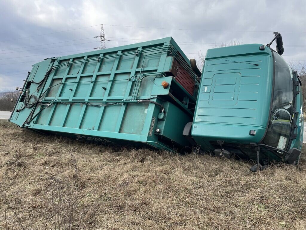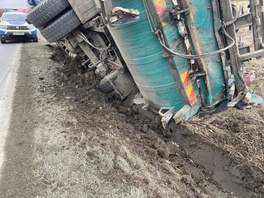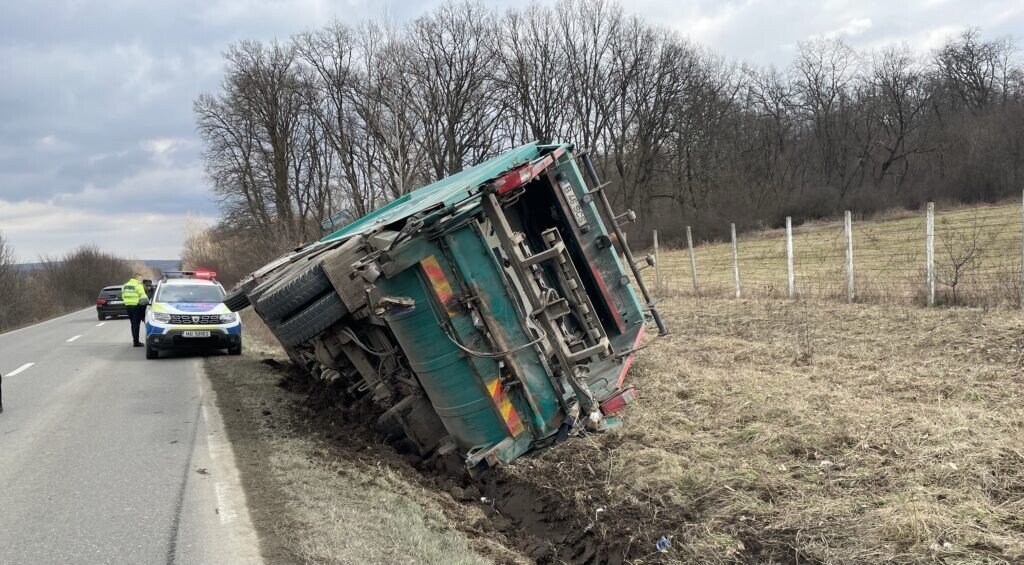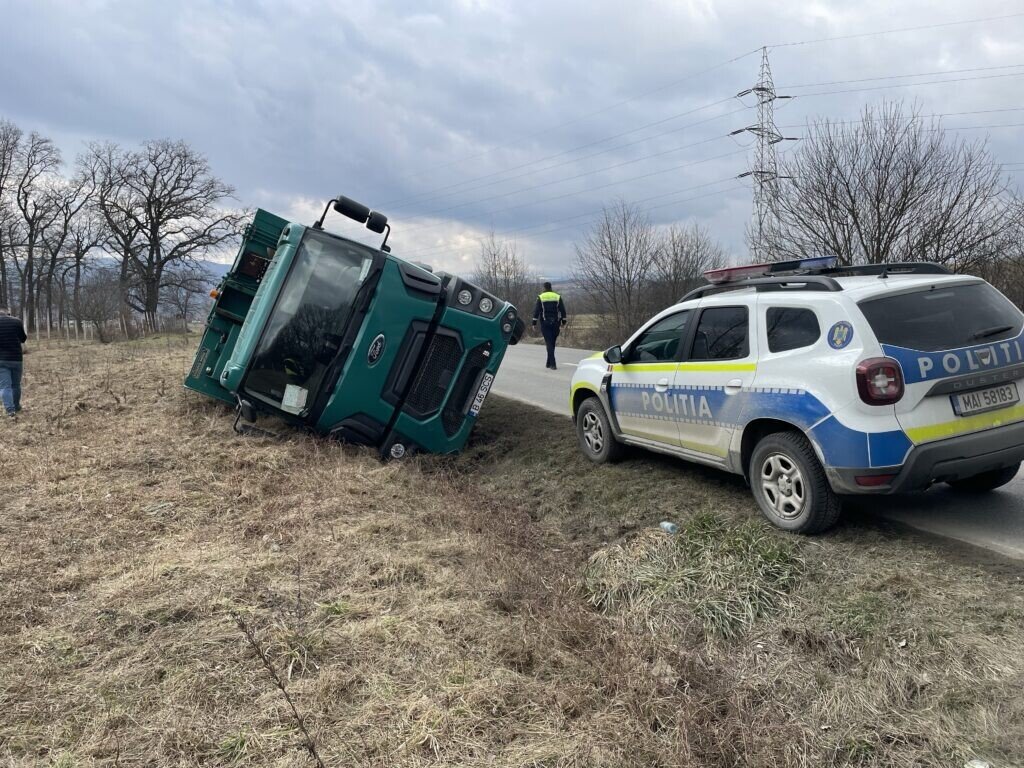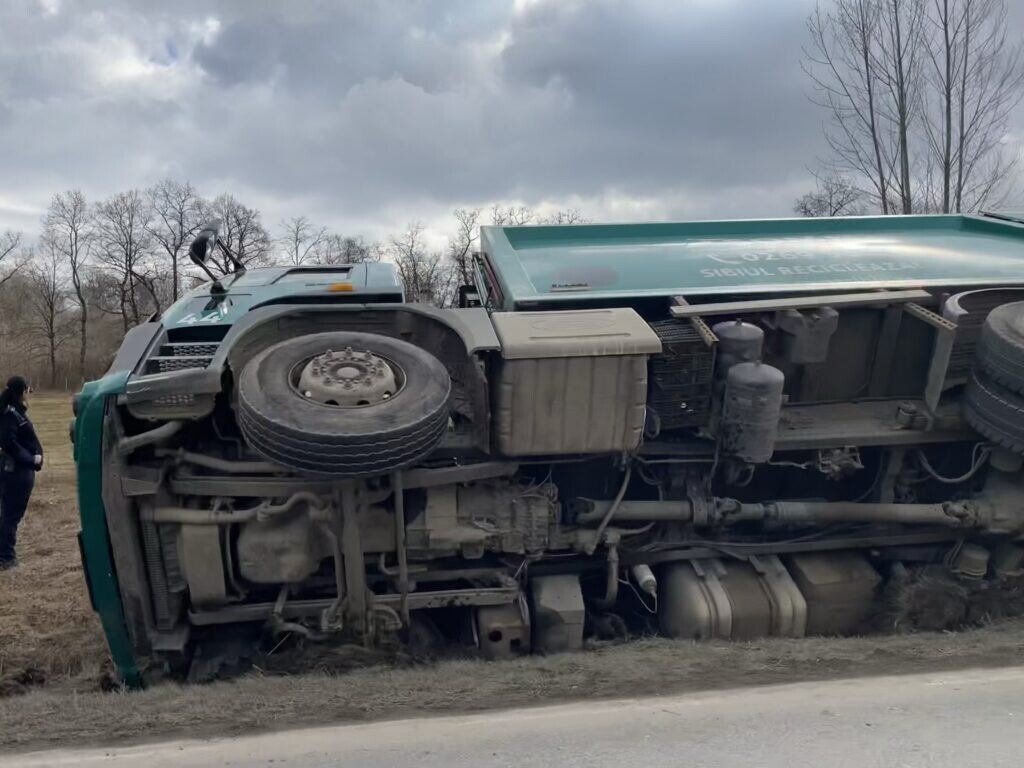 Șoferul unei mașini de gunoi ce aparține companiei SOMA a pierdut controlul direcției de deplasare și s-a răsturnat pe marginea drumului. Evenimentul rutier s-a produs DJ106D, pe sensul drumului Cisnădie – Sibiu.