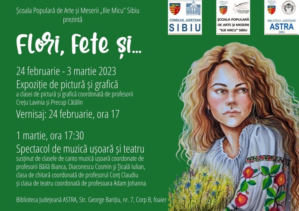 Astăzi, de la ora 17:00, la Biblioteca Astra Sibiu, Corp B, Foaier, Școala Populară de Arte și Meserii “Ilie Micu” Sibiu vă invită la vernisajul expoziției de pictură și grafică a claselor coordonate de Lavinia Crețu și Cătălin Precup. Tema lucrărilor este primăvara, iar expoziția poate fi vizitată până în data de 3 martie.