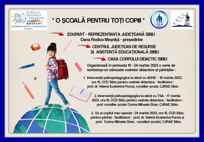 Federația Națională a Părinților “EDUPART” – Reprezentanța Județeană Sibiu, în colaborare cu Centrul Județean de Resurse și Asistență Educațională Sibiu organizează în perioada 10 – 24 martie 2023 o serie de workshop-uri adresate cadrelor didactice și părinților: