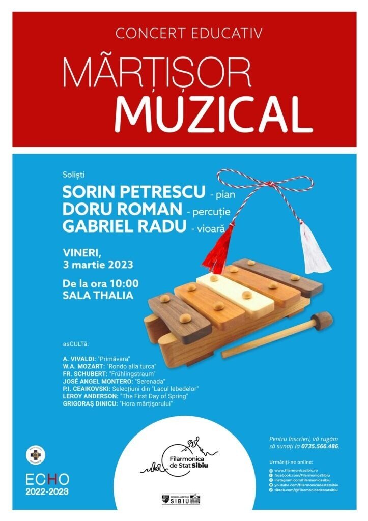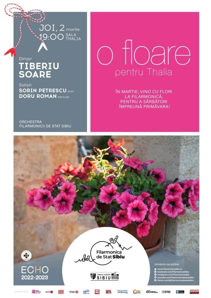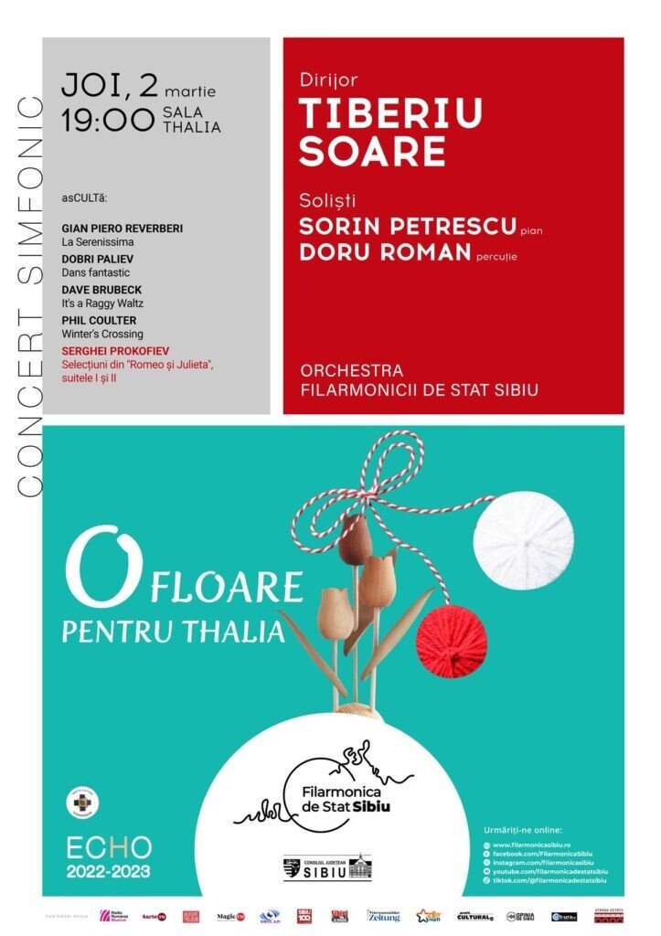 “Vă aștept, joi, 2 martie, de la ora 19.00, cu «O floare pentru Thalia»! Un concert dedicat eternului feminin, frumuseții din viața noastră și a tuturor lucrurilor care ne înconjoară. Pentru prima parte, soliștii Sorin Petrescu și Doru Roman au conceput un program special pentru deliciul ascultătorilor. În partea a doua a serii, vom aborda fragmente dintr-un balet celebru al lui Serghei Prokofiev, e vorba de «Romeo și Julieta», eterna poveste de dragoste, o muzică absolut splendidă și vă așteptăm să ne bucurăm împreună de ea. Noi lucrăm aici de zor, la Filarmonică, la repetiții și vă așteptăm cu drag. De altminteri, vă așteptăm toată luna martie cu o floare pentru Thalia, pentru a înfrumuseța tot ceea ce avem aici!”, transmite maestrul Tiberiu Soare.