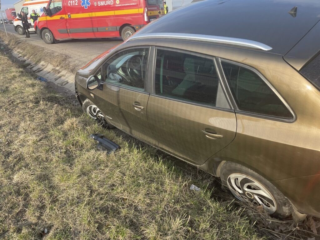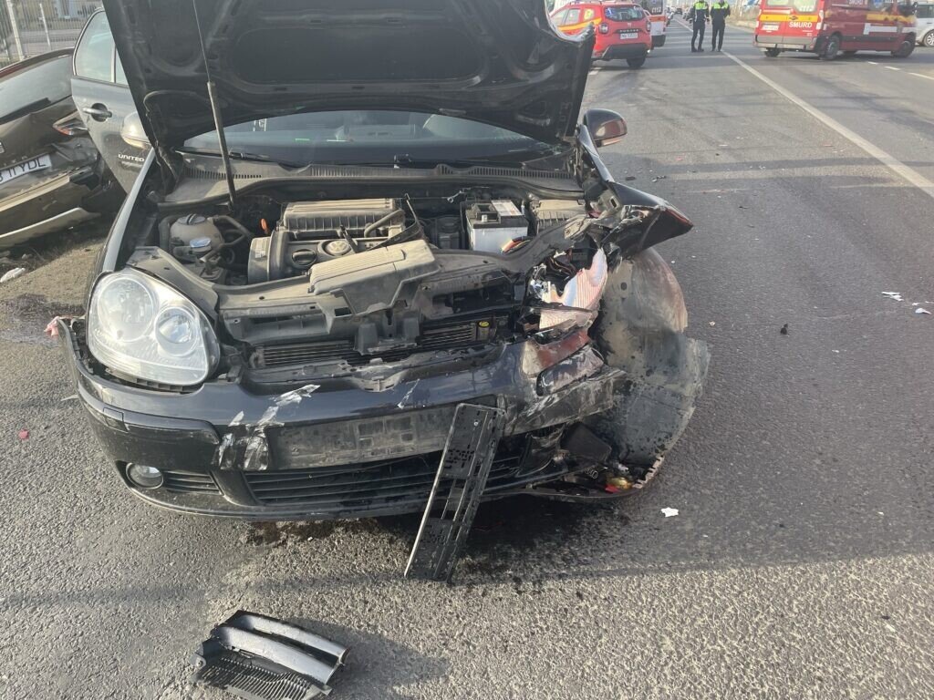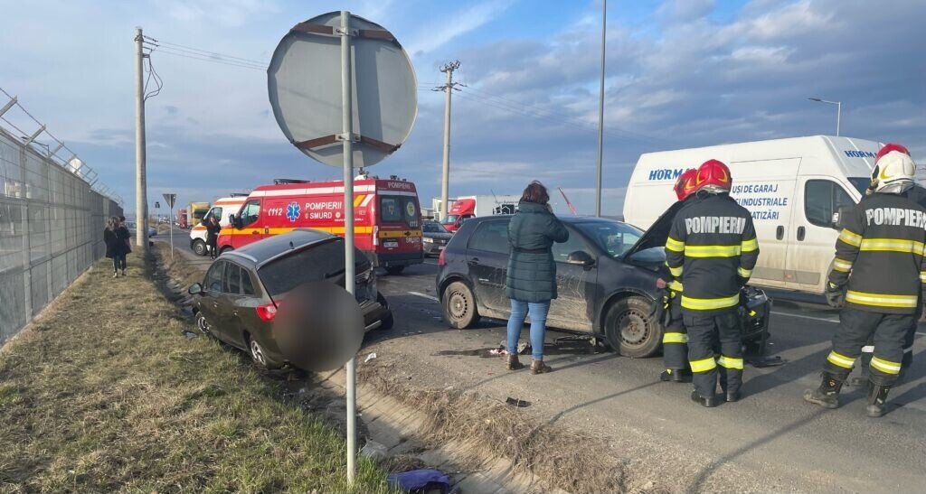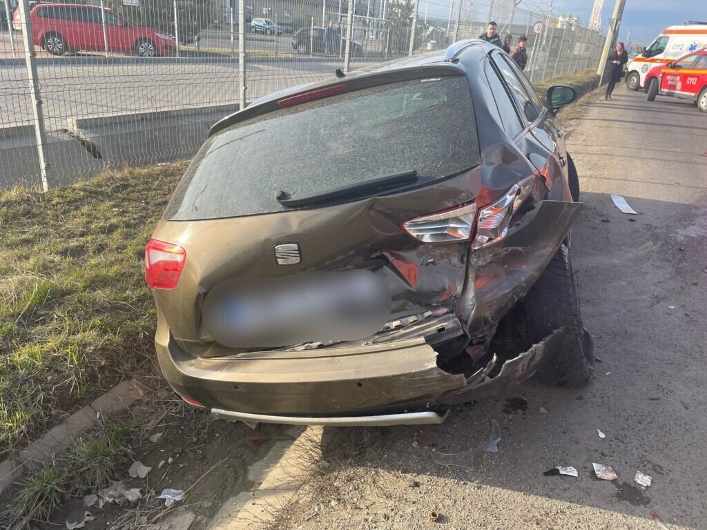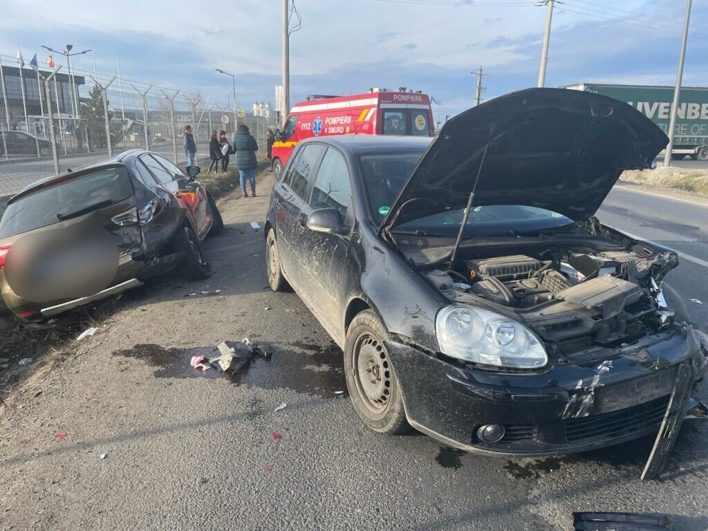 Două mașini au intrat într-o coliziune violentă chiar în fața fabricii Continental din Sibiu. În urma impactului, cel puțin o persoană a fost rănită.