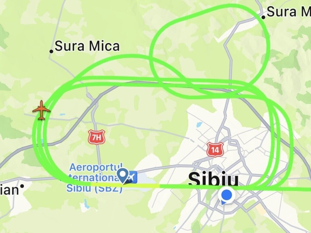 Astfel, aeronava efectuează mai multe survoluri pe deasupra orașului Sibiu, pe linia aeroportului. Astfel de exerciții sunt extrem de benefice pentru piloți la aterizare și decolare.