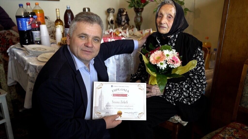 Primarul municipiului Mediaș, Gheorghe Roman, a vizitat-o vineri pe doamna Susana Ziekeli, cu ocazia împlinirii venerabilei vârste de 100 de ani. Alături de comandantul Unității Militare UM 01810, Cristian Colocoșel și de muzeograful Dan Ramf, edilul șef al Mediașului a oferit doamnei Ziekeli flori, o diplomă aniversară, dar și un premiu în bani, în semn de respect și recunoștință, cu prilejul împlinirii acestei venerabile vârste.