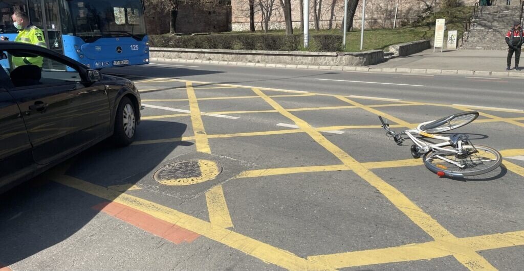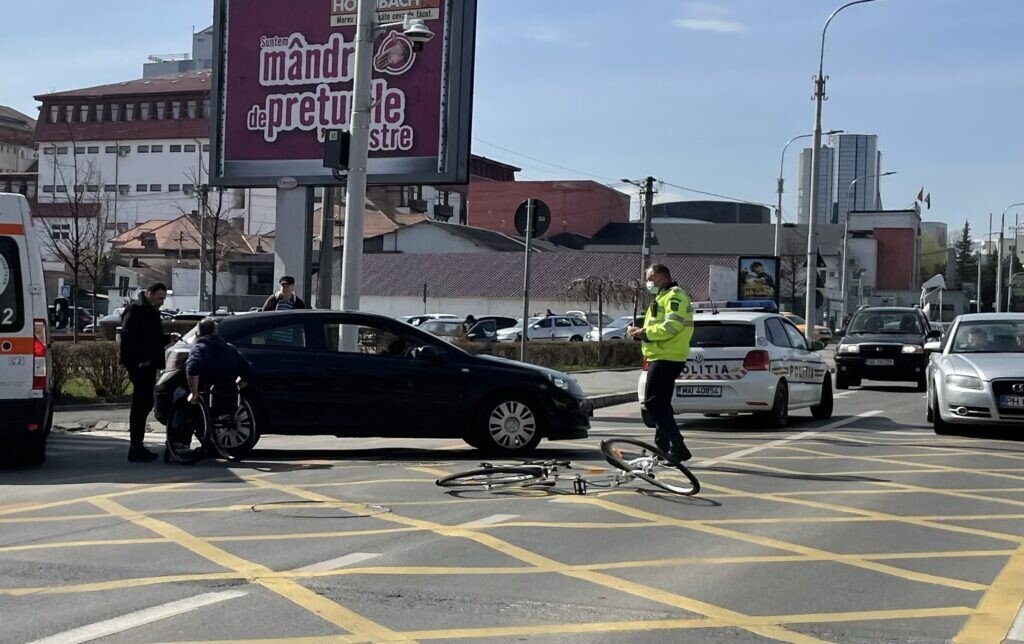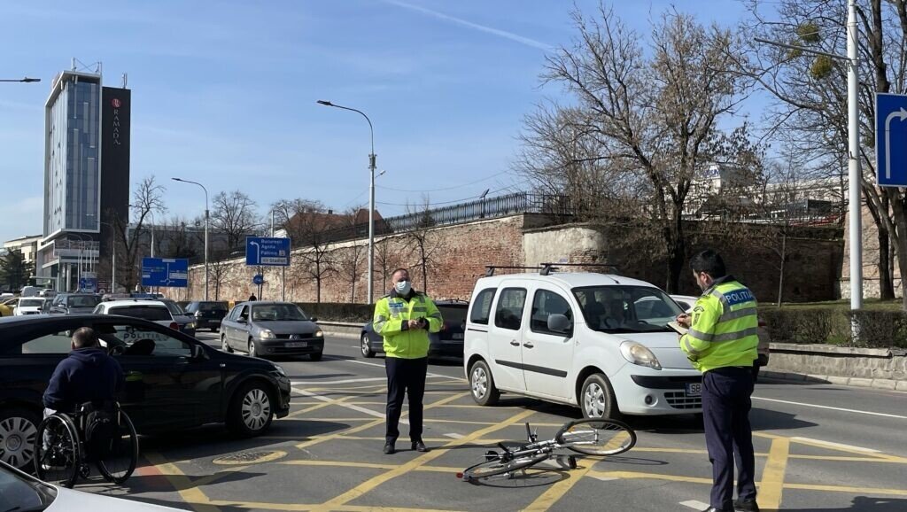 „Un sibian în vârstă de 44 de ani, a pătruns în intersecția cu Bvd. Corneliu Coposu fără să acorde prioritate și a lovit o bicicletă condusă spre strada Constituției, pe banda special destinată, de către o sibiancă în vârstă de 20 de ani.” transmite IPJ SIBIU