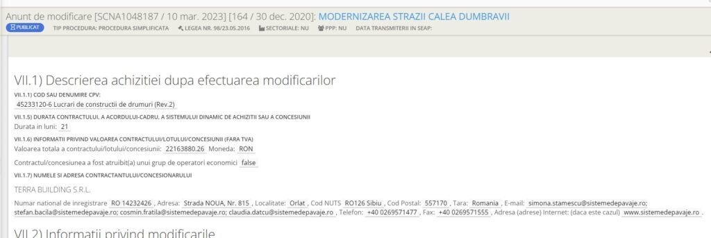 Dar în 6 ianuarie, 6 februarie și 10 martie 2023, Primăria Sibiu a încheiat 3 noi anexe la contract cu Terra Building Srl. Astfel, dacă la 22 decembrie 2022, când Calea Dumbrăvii a fost anunțată ca finalizată, valoare contractului era de 18,29 milioane lei plus TVA, astăzi a ajuns la 22,16 milioane lei plus TVA.