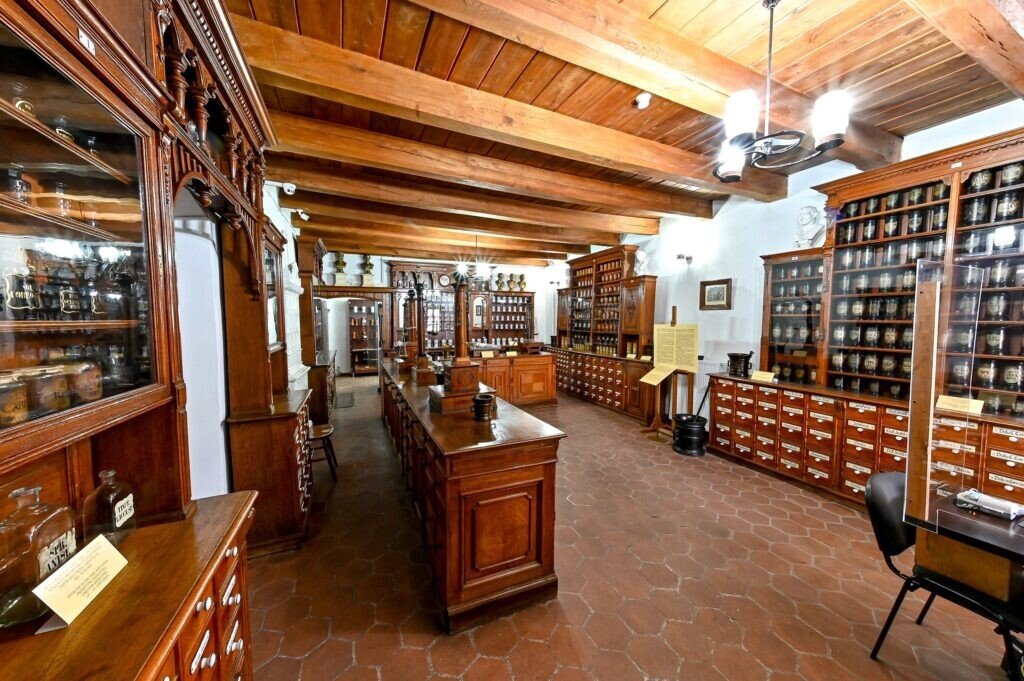 Muzeul se prezintă sub forma unei farmacii de epocă cu oficină şi laborator ce adăpostesc peste 6600 de piese şi instrumente farmaceutice.
