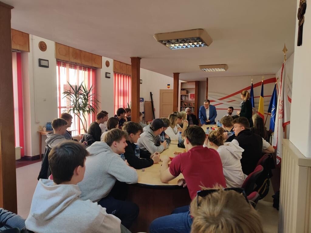A fost o discuție liberă, în care oaspeții noștri au interacționat cu dr. Ștefania Șerban și cu Sebastian Șebu, subprefect al județului Sibiu, care, asistați de Marius Novac, inspector școlar general, de Pavel Bichicean, consilier județean, și de reprezentanți ai Tineretului Social Democrat, au răspuns la numeroase întrebări pe diverse teme: economie, sistemul românesc de învățământ, fiscalitate, nivel de trai, consumul de droguri în rândul elevilor, corupție, infrastructură, administrație, politică, natalitate, demografie, migrație, mediu, energie verde.
